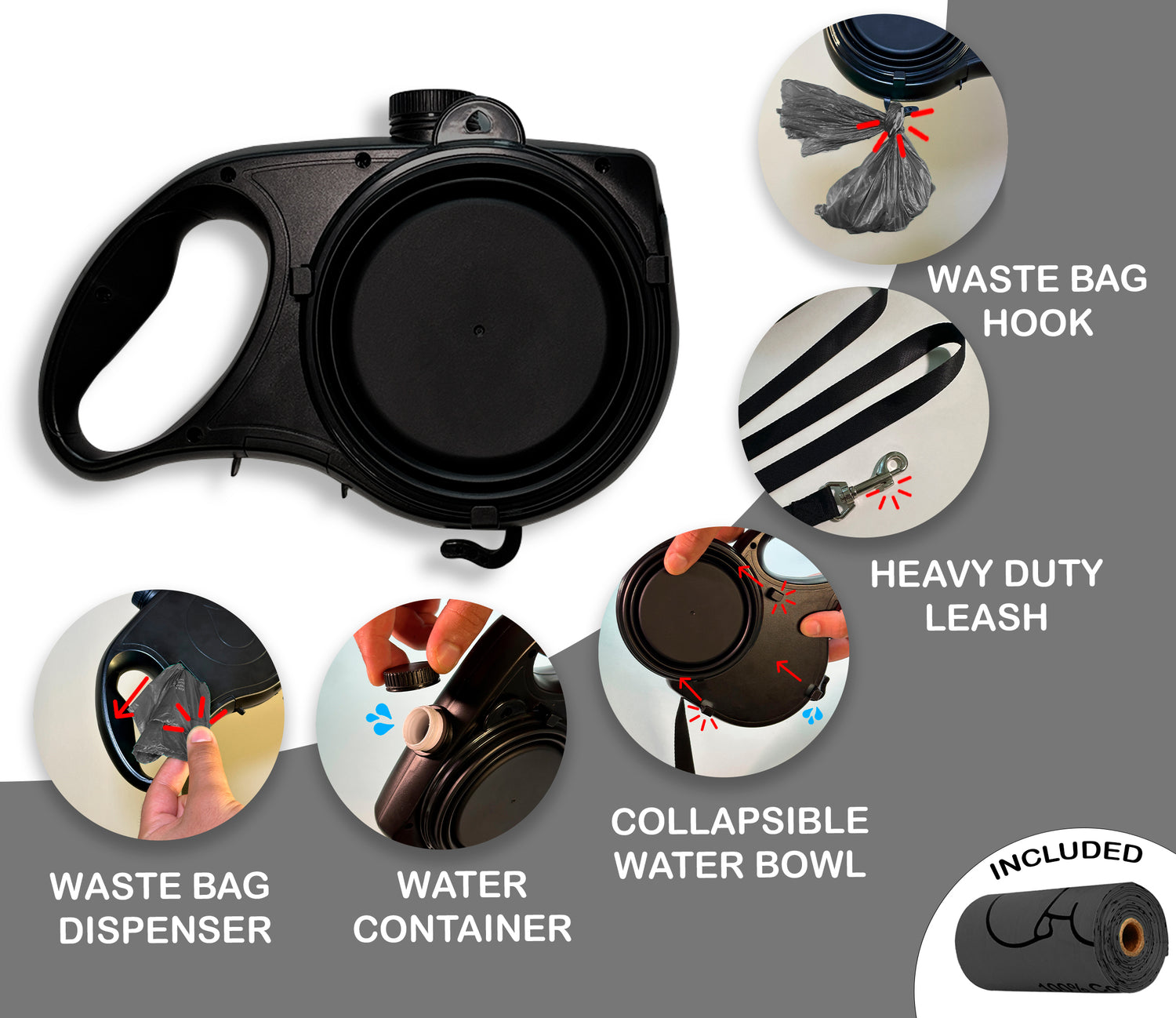 Simplify your strolls! Our leash comes with a water tank, collapsible bowl, and waste dispenser!